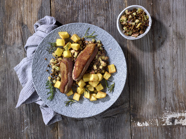 Entenbruststreifen auf Pommes Sautées & warmem Apfel-Linsensalat