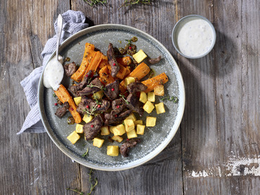 Mariniertes Rindergeschnetzeltes mit Ofenkarotten, Butter-Kartoffelwürfeln & Senfcreme