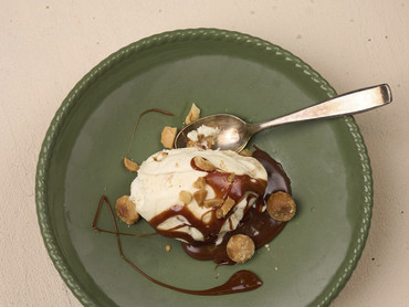 BIO Macadamia Crunch Eis mit Karamellsauce und gerösteten Macadamianüssen