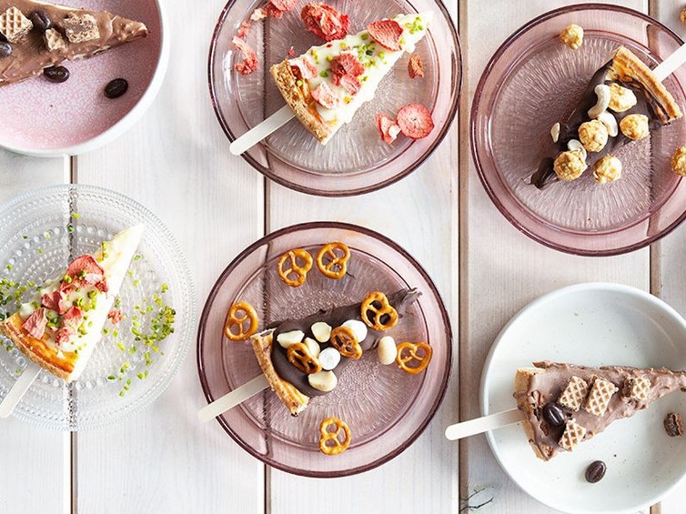 Steek in een punt (ontdooide) cheesecake een ijslollystokje en laat ze dan weer 30 minuten opstijven in de vriezer. Zet alle versieren klaar voor de cheesecake. Smelt bijvoorbeeld chocolade (naar wens witte, melk- of pure chocolade), zet bakjes klaar met nootjes, smarties, spekjes e.d. De gesmolten chocolade zorgt ervoor dat de versiering blijft plakken. Tip: leg de punten op bakpapier om geklieder te voorkomen!