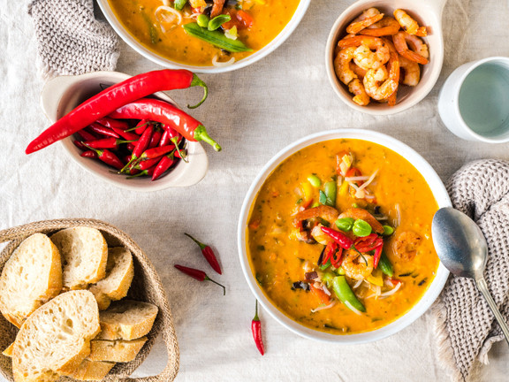Unsere zweite Eintopf-Version ist exotisch angehaucht. Für unseren asiatischen Garnelen-Eintopf nehmen wir als Basis die eismann rote Linsen-Kokos-Suppe, die durch die Kokosmilch sehr fernöstlich daherkommt. Es braucht nur wenige Handgriffe, um den asiatischen Eintopf zu vollenden.