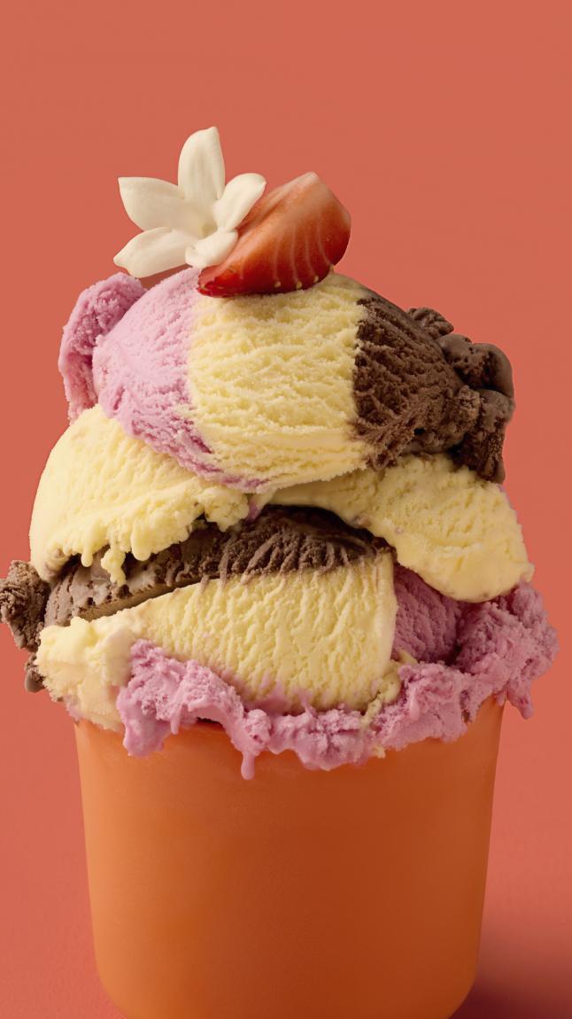 Drie van de meest gewilde ijssoorten bij elkaar. Voor elk wat wils; aardbei, vanille of chocolade.