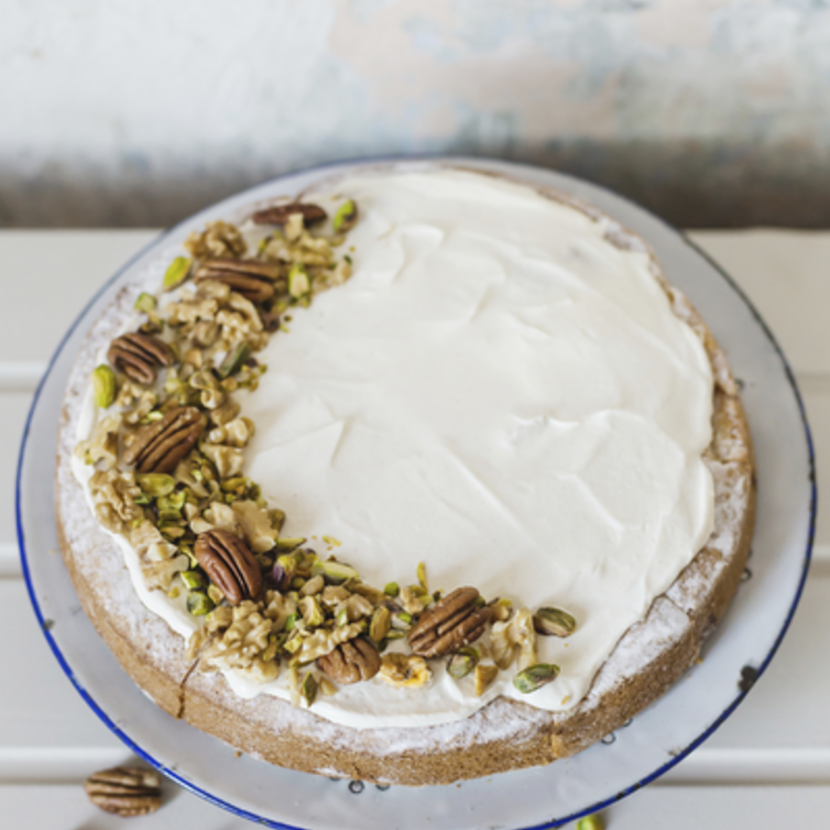 Hak de noten en strooi ze over de taart