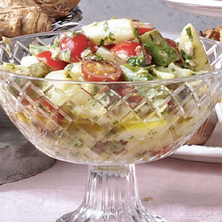 Halveer de cherry tomaatjes. Maak een vinaigrette van artisjokharten, basilicum, olijfolie, balsamicoazijn, water, mosterd, zout, peper en suiker.