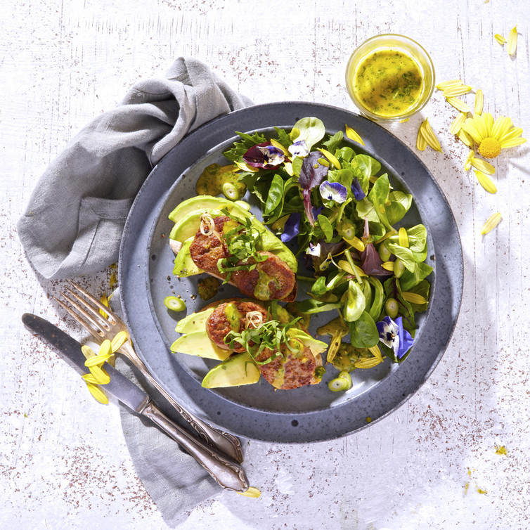 Avocado-Frikadellen-Sandwich mit Wildblumensalat