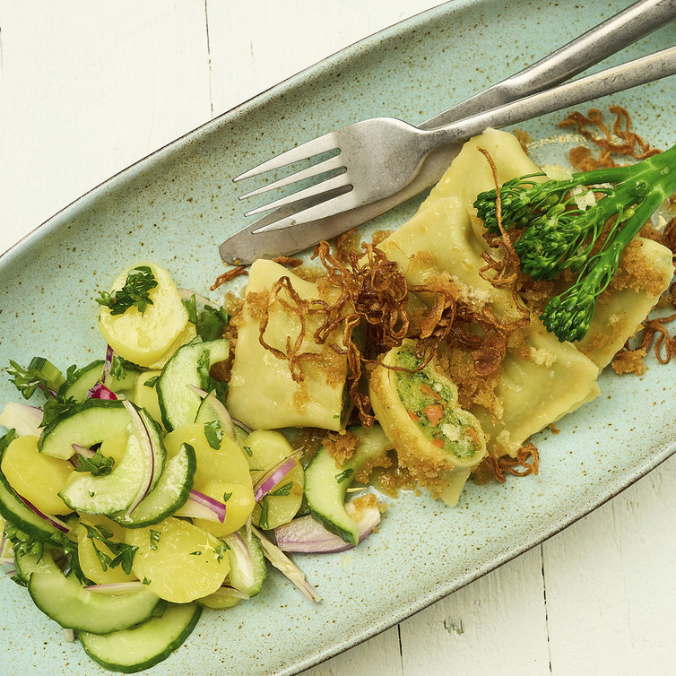 BIO-Gemüsemaultaschen mit Kartoffel-Gurkensalat & gerösteten Zwiebeln