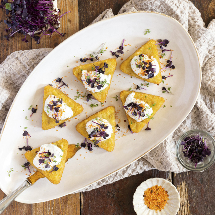 Die Knusperecken auf einer Grillplatte knusprig grillen. Mit dem Minze-Kräuterdip servieren.
