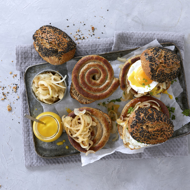 Die Brötchen aufschneiden und die Unterhälfte mit der Bratwurstschnecke belegen, dann mit Gemüsezwiebeln, Ei und Honig Senfsauce dekorieren. Die Brötchen- Oberhälfte darauflegen und guten Appetit!