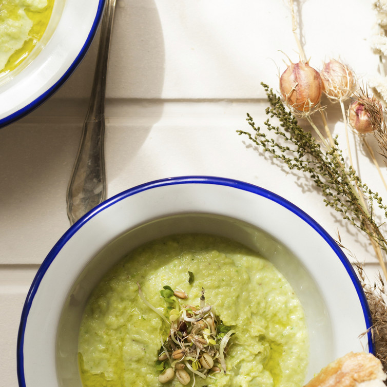 Die Suppe in vorgewärmte Teller oder Bowls füllen und mit dem restlichen Olivenöl besprenkeln und mit Sprossen bestreut servieren.