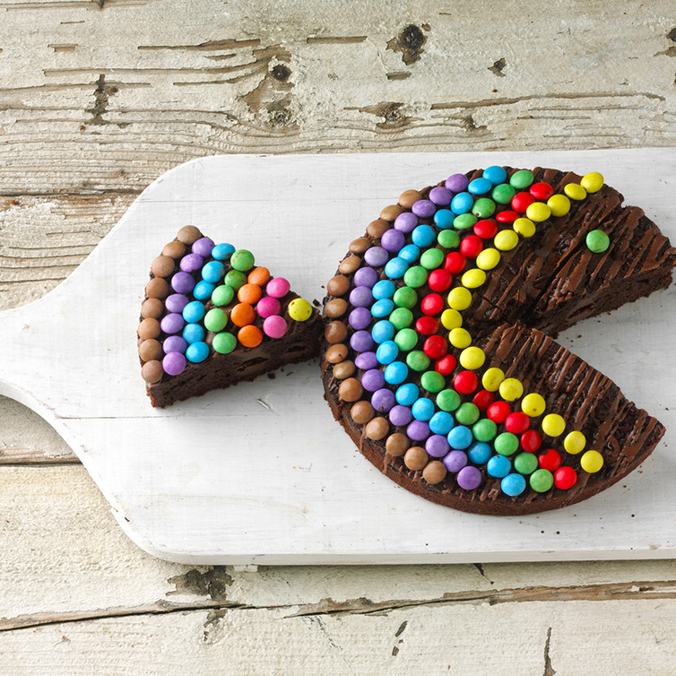 Den Kuchen nun reihenweise ganz dünn mit Schokglasur bepinseln und die bunten Schokolinsen zügig auflegen. Ob in einfarbigen Streifen oder bunt durcheinander das entscheiden Sie.