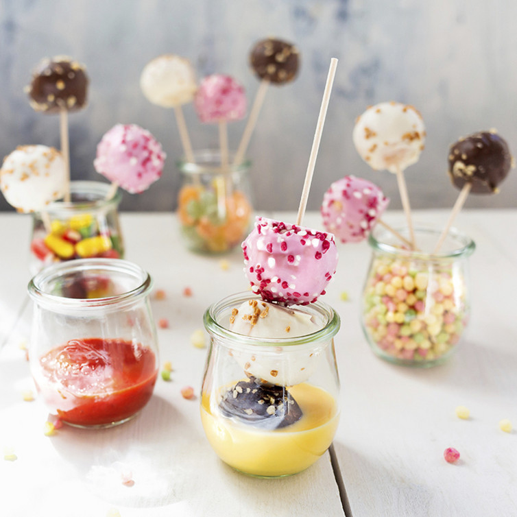 Variante 3: Die Pop Dots ® mit Zuckeraugen wie Gesichter dekorieren, ggf. kleine Hütchen daraufsetzen. Auf einen Spieker stecken und in ein Glas mit Gummibärchen stecken.