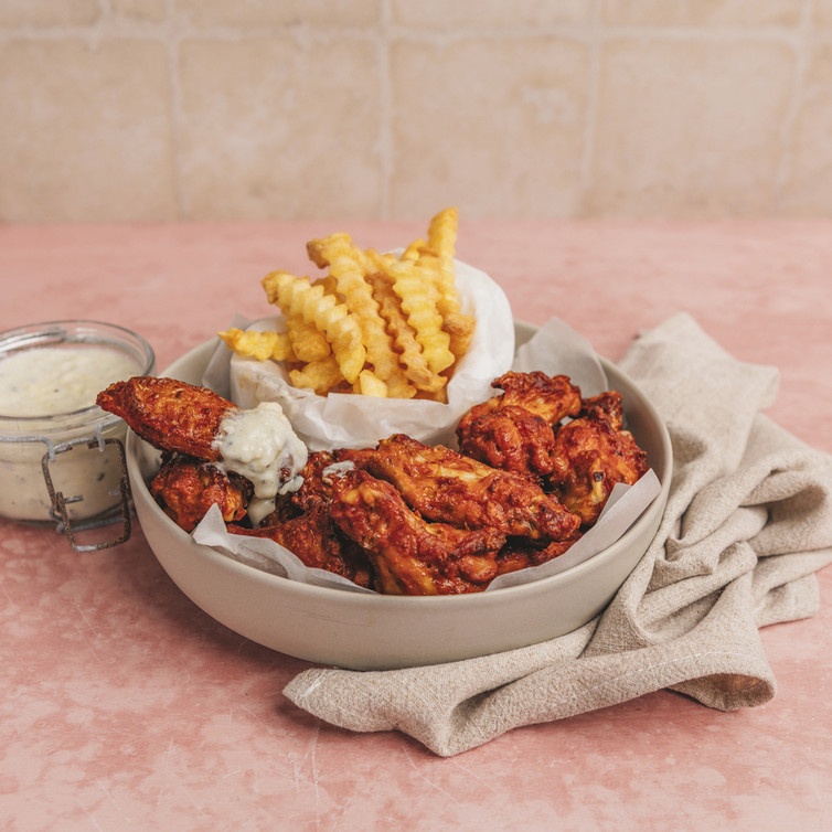Die Chicken Wings zusammen mit den knusprigen Zick-Zack-Pommes anrichten und mit dem Blue-Cheese-Dip servieren.