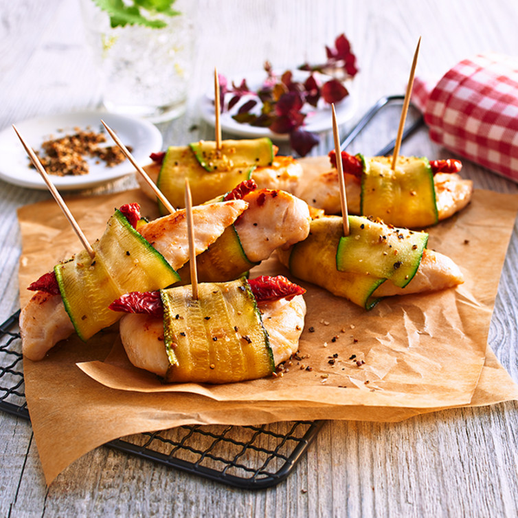 Halveer de gedroogde tomaten. Leg een kipfilet en een halve gedroogde tomaat op elke courgette. Rol het op en maak vast met een satéprikker.