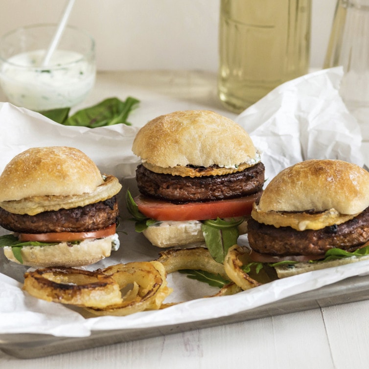 Nun die Burger belegen: Brötchenunterhälfte, Sour Cream, Salat, Tomate, kein-Hack Burger, Onion Rings, ggf. Sour Cream und Brötchenoberhälfte. Sofort servieren und genießen.