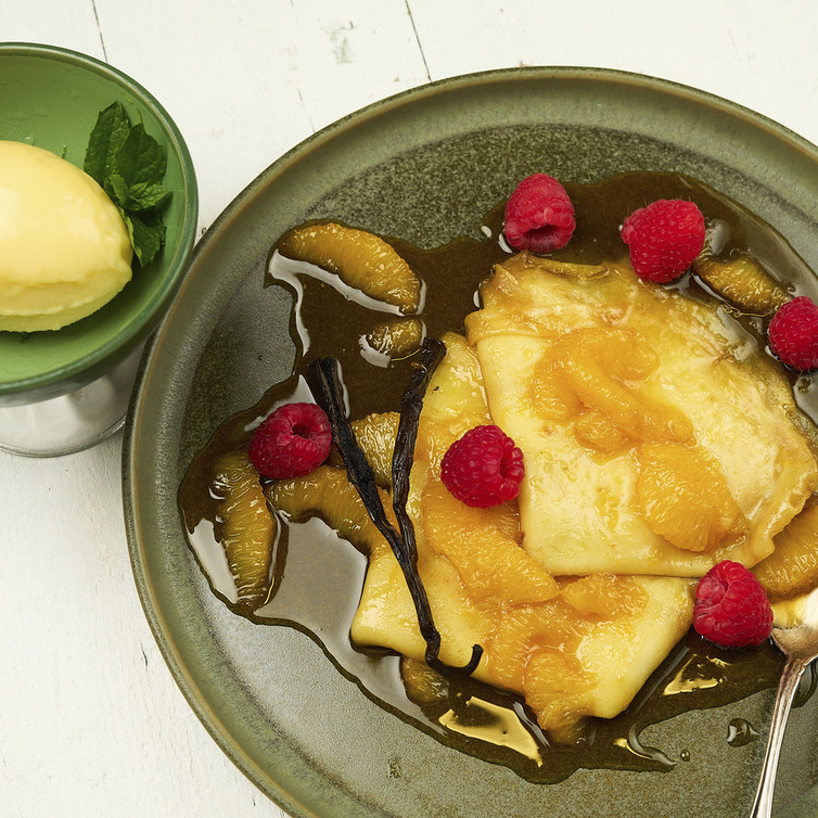 Crêpes Suzette mit Bio Mandarinen Sorbet