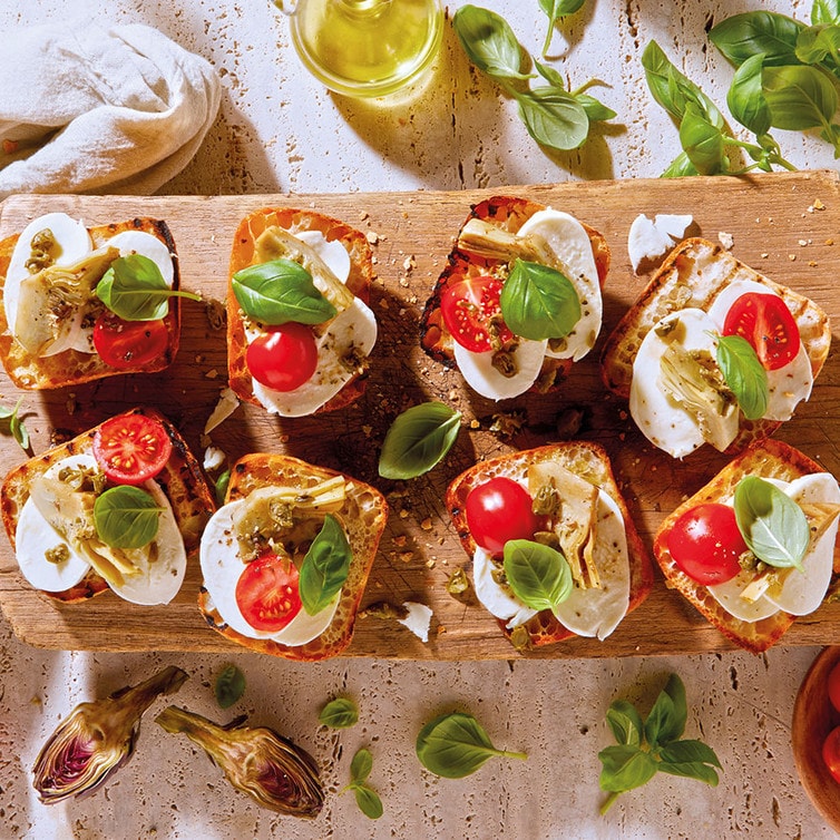 Je 2-3 Scheiben Mozzarella, die Cherrytomaten und die marinierten Artischockenviertel auf die Brötchenscheiben legen und mit frischem Pfeffer würzen. Mit Basilikumblättchen und ggf. Kapern dekorieren.