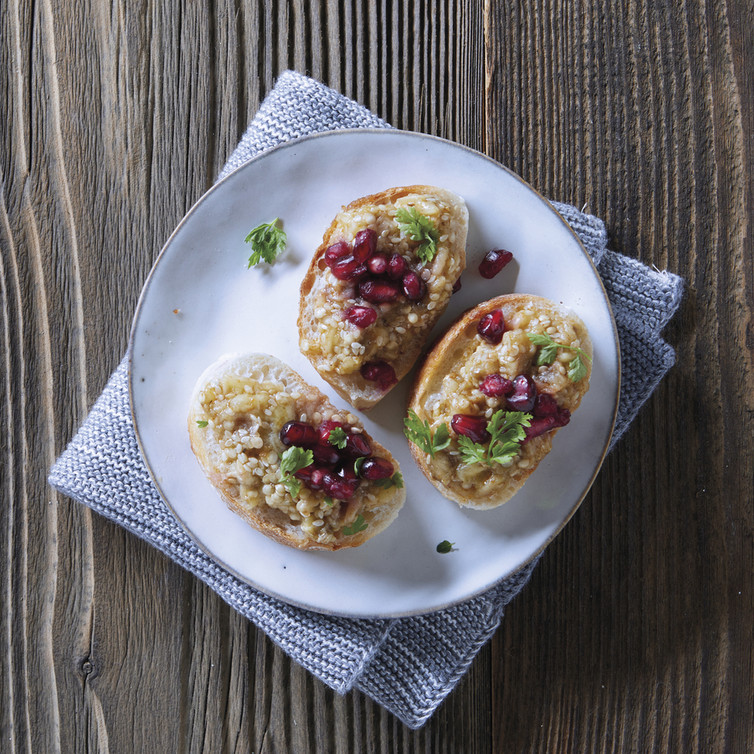 Die Brötchen dick mit der Auberginen Creme bestreichen. Mit Granatapfelkernen dekoriert genießen.