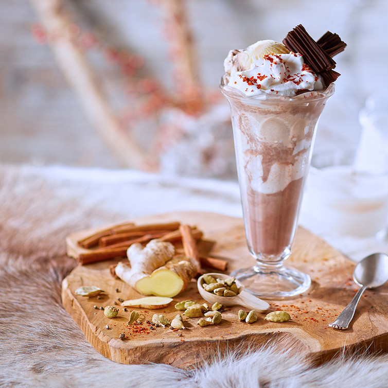 Den heißen Kakao in eine große Tasse geben, nun je eine Kugel Kopenhagen und eine Kugel Haselnuss schnell dazu geben.