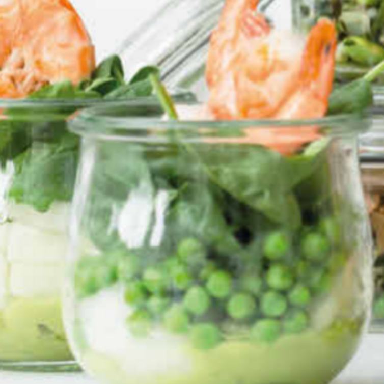 Maak de glazen op in laagjes: eerst de avocadodip, de stukjes meloen of ananas, de erwten en de spinazie en maak af met de gebakken garnalen.