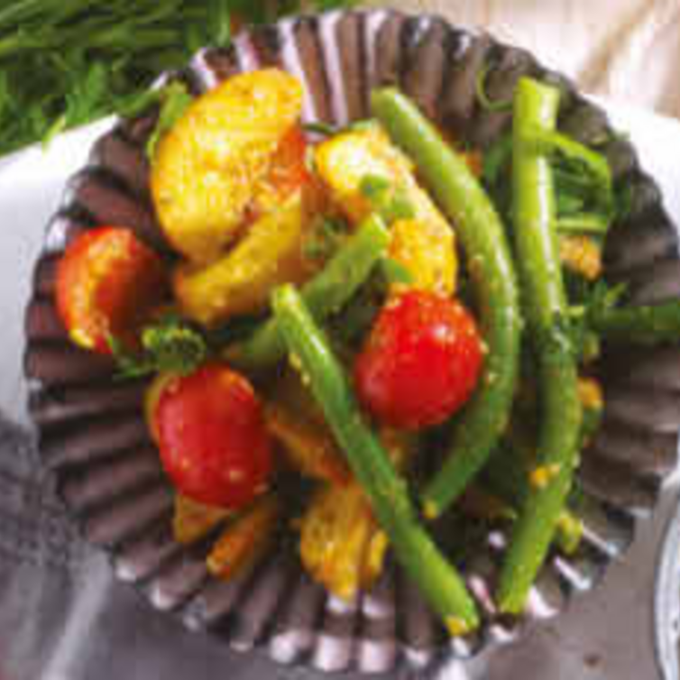 Meng de pesto, olie en azijn door elkaar voor een dressing en meng het met de bonen, lauwwarme aardappelen en tomaten en breng op smaak met zout en peper.