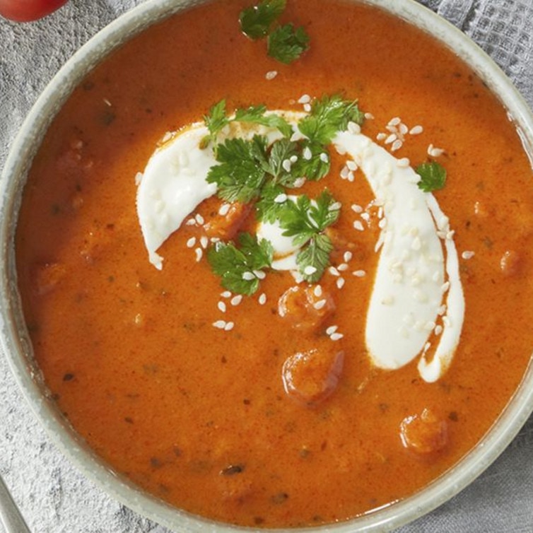 Verdeel de hete soep over vier mooie diepe borden of kommen en garneer met de zure tahini-room.