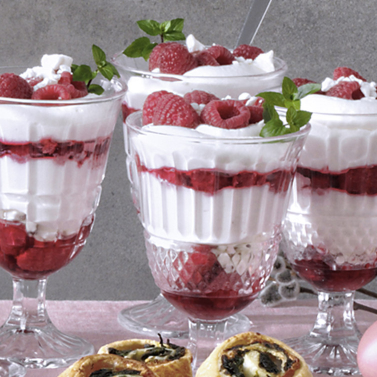 Wie zei dat heerlijke desserts tijdrovend en duur zijn? Deze kleine fruitige delicatesse is niet alleen in een mum van tijd klaar, u kunt hem ook heel goed vooraf bereiden en later serveren. Verfijn het met frambozenbrandewijn of jenever en garneer de gevulde glazen met pure chocoladeschaafsel.