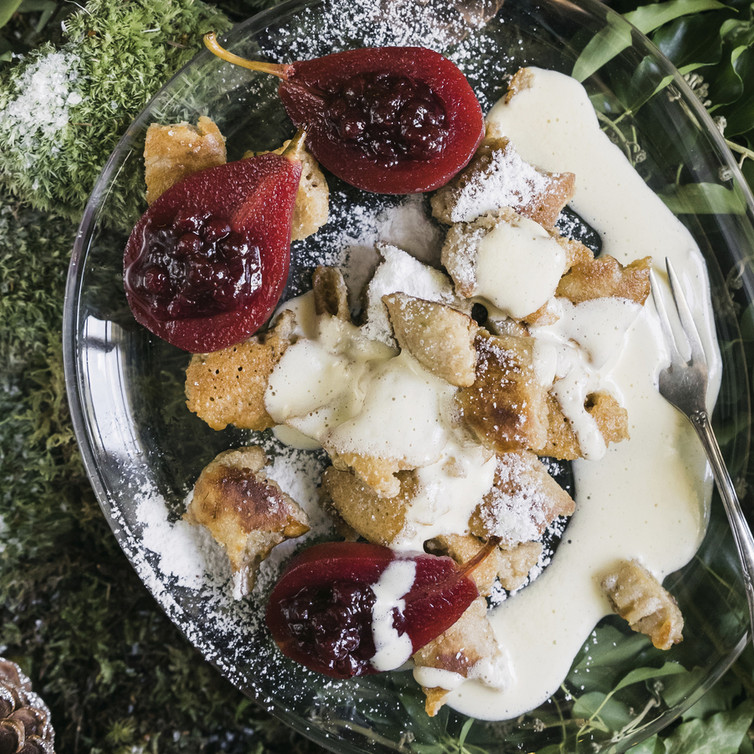 Dinkelschmarrn mit gefüllter Rotweinbirne und weißer Zimtzabaione (von Johann Lafer)