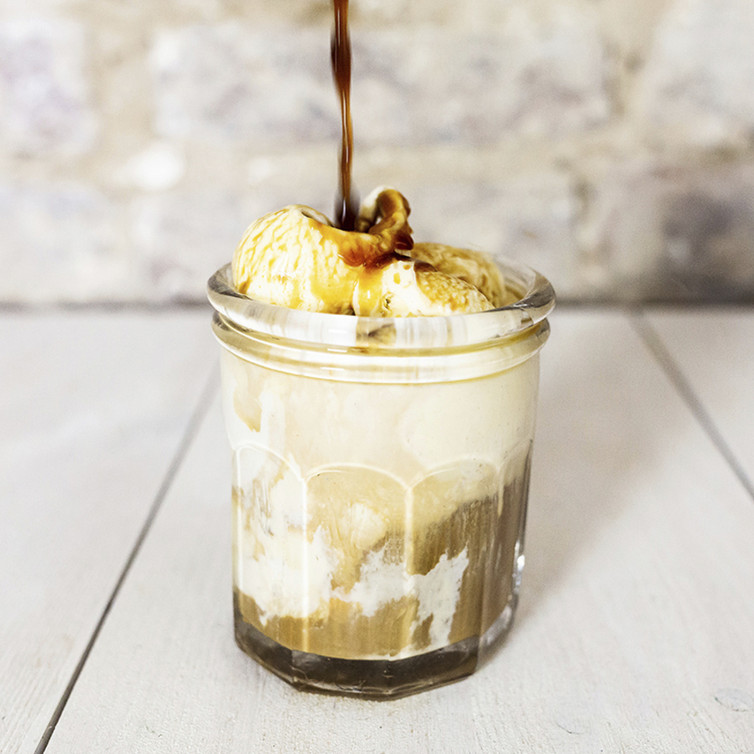 Pro Portion jeweils 2 Kugeln Schokoeis in die Gläser geben.