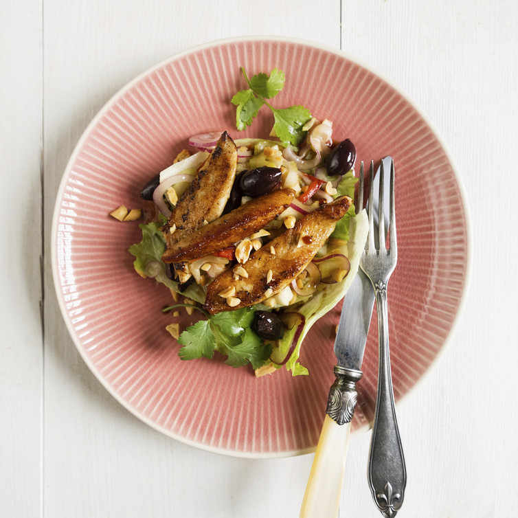Eisberg-Birnen-Sellerie Salat mit Erdnussdressing und gebratenen Hähnchenststreifen (von Johann Lafer)