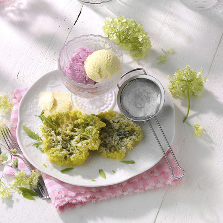 Die fertigen Blüten hübsch mit je einer Kugel Erdbeer- und Vanille Eis anrichten. Mit Puderzucker bestäuben und servieren.