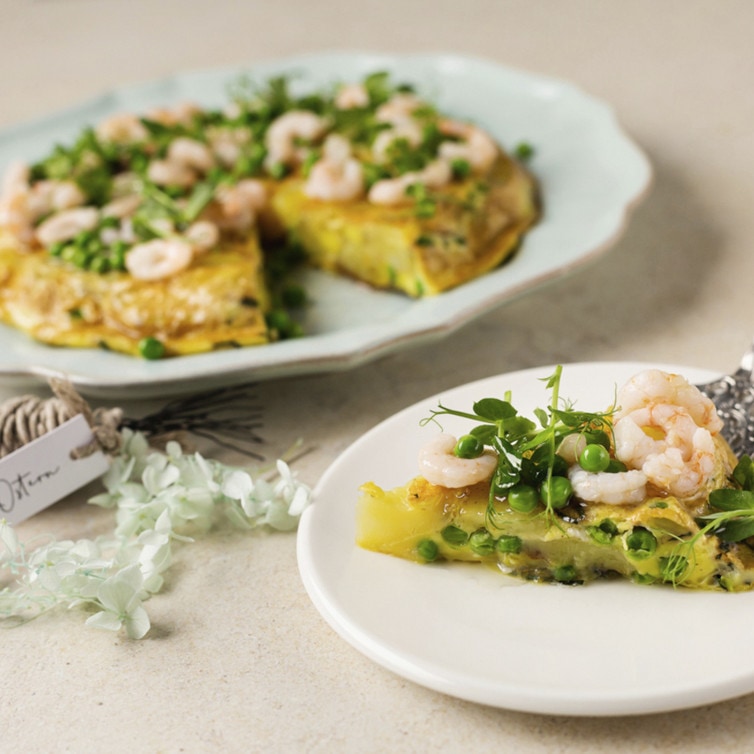Die Hälfte der Tiefseegarnelen in einer Ofen-tauglichen Pfanne mit der Butter anschwitzen. Kartoffeln zugeben und mit der Eiermasse übergießen. Minze in feine Streifen schneiden und über die Frittata streuen. Erbsen ebenfalls darüberstreuen.