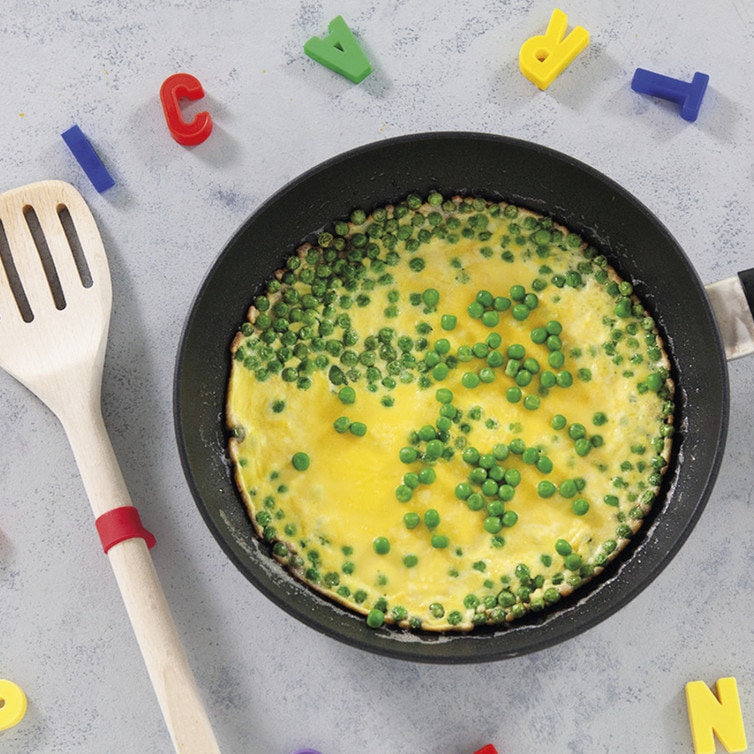 Pro Pfannkuchen etwas Butter in die Pfanne geben und ca. 100g Erbsen. Diese werden ca. 5 Minuten bei mittlerer Hitze vorgegart. Nun den Pfannkuchenteig dazu geben und goldgelb von beiden Seiten backen. Im Backofen warmhalten.