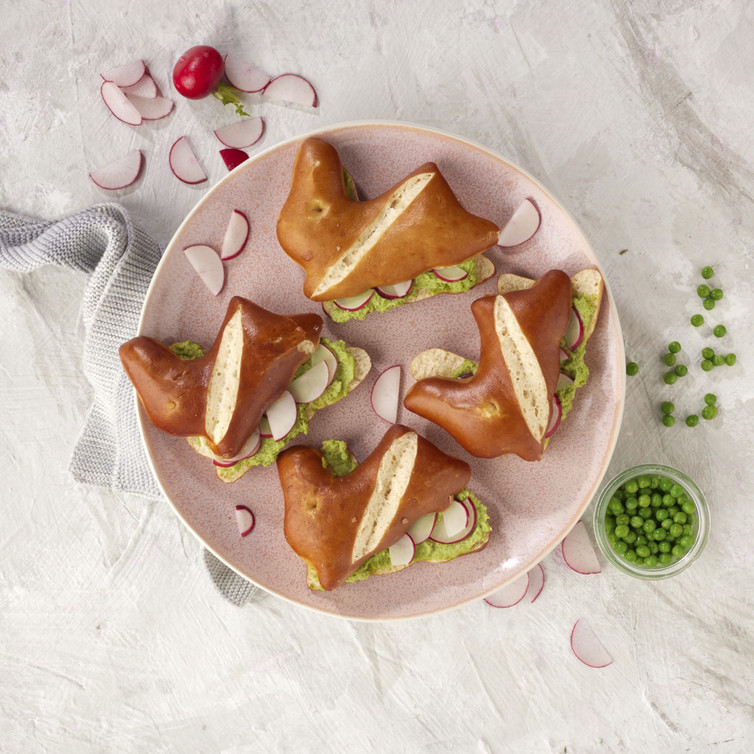 Erbsenhumus mit Radieschen und Laugenhäschen