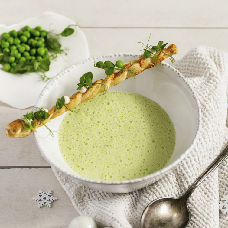 Erbsenschaumsuppe mit Parmesan-Blätterteigstange