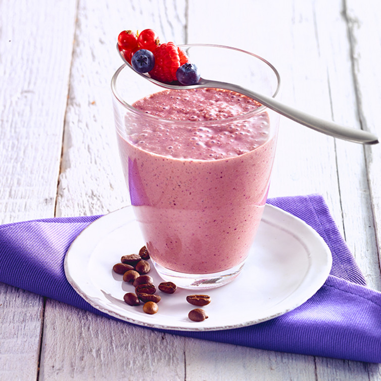 Banane mit der süßen Beerenmischung, dem Vanillezucker, der Milch und dem Espressopulver im Mixer fein pürieren.