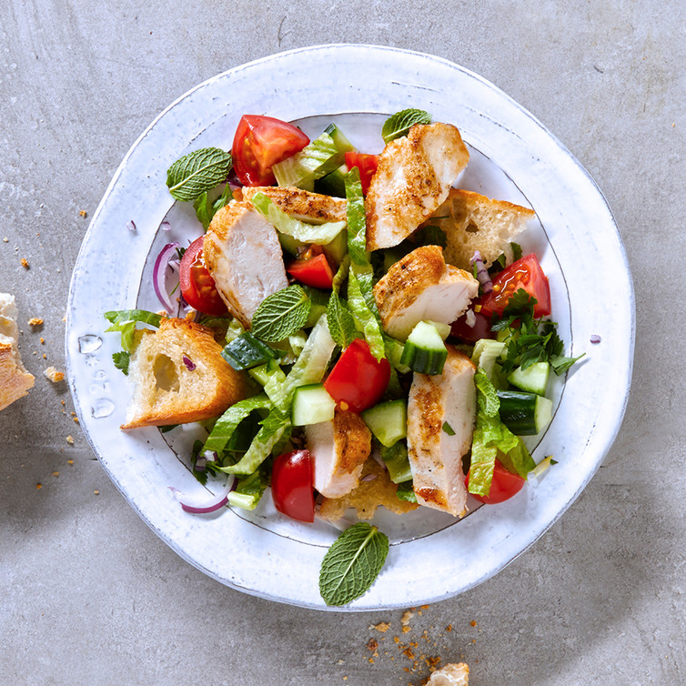 Währenddessen den Salat, die Tomaten, Gurke und Petersilie in das Dressing geben, gut vermengen. Erst kurz vorm Servieren die gerösteten Brotscheiben vorsichtig unterheben. Die Hähnchenbrust schräg aufschneiden und auf dem Salat anrichten. Minze Blättchen drüber streuen und servieren.