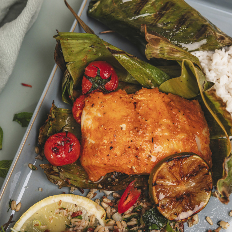 Bananenblätter kurz über Hitze erwärmen, damit sie weich werden. Je Portion ein großes Blatt auslegen, darunter mittig ein zusätzliches rechteckiges Stück platzieren und alles leicht einölen. Den marinierten Fisch darauflegen, Kirschtomaten und Limettenscheiben zugeben und die Blätter zu festen Päckchen verschließen.