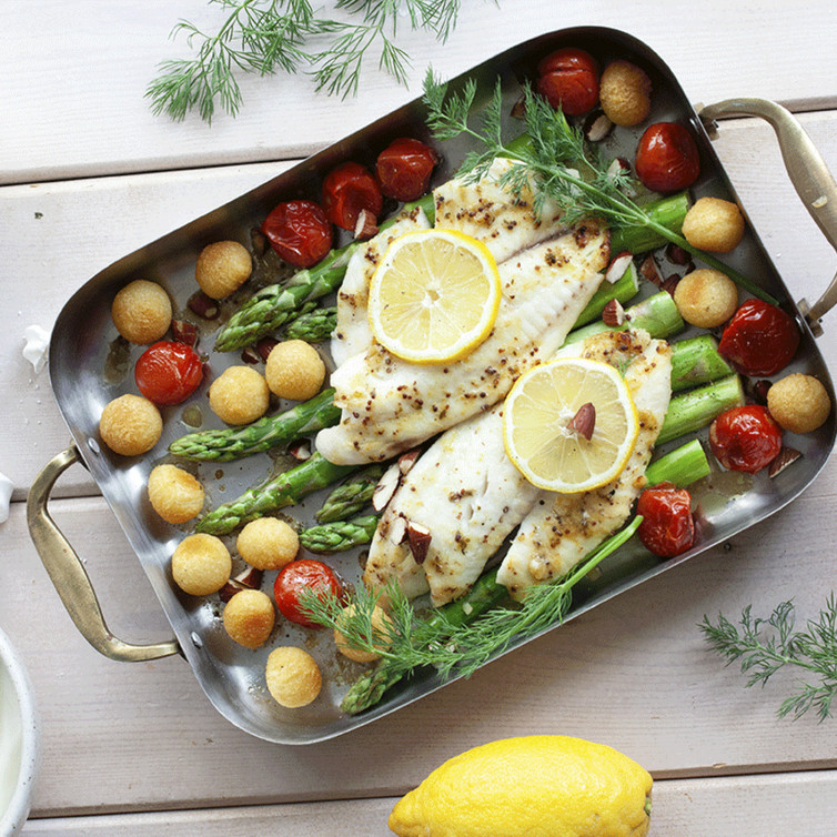 Auf dem Fisch das Honig-Senf-Dressing und Zitronenscheiben verteilen. Die gehackten Mandeln drüberstreuen.