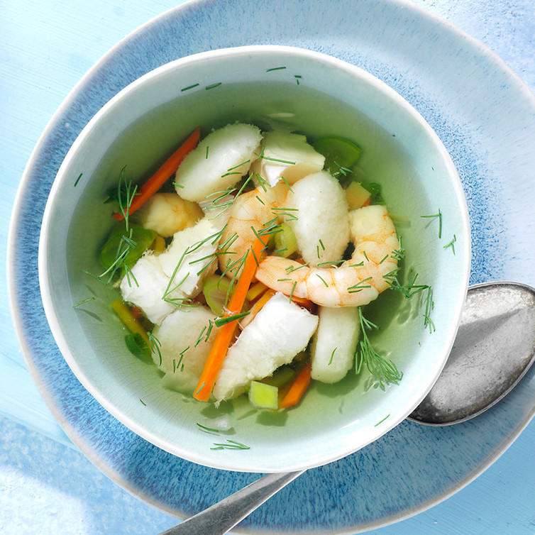 Fischfilet in die Suppe geben und bei geringer Hitze ca. 5 - 7 Minuten gar ziehen lassen. Riesengarnelen und Fischklößchen zufügen und ebenfalls kurz miterhitzen, aber nicht kochen. Lorbeerblatt entfernen und die Suppe mit Salz und Pfeffer abschmecken.