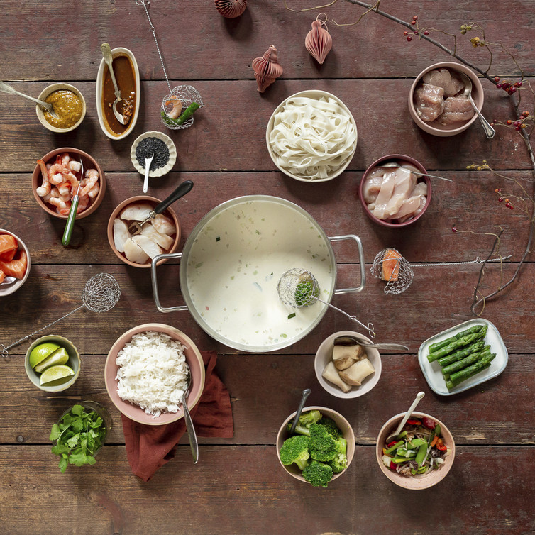 Für die Kokos-Curry-Brühe: Das Kokosöl erhitzen und das Bouillongemüse, den Knoblauch und den Ingwer zugeben und alles ca. 5 Minuten mitbraten. Kurkuma und Currypaste untermischen, mit Kokosmilch und ca. 2 l Wasser oder Gemüsebrühe ablöschen und weitere 20 Minuten köcheln lassen. Am Ende alles durch ein Sieb geben und die Brühe für das Fondue ist fertig.