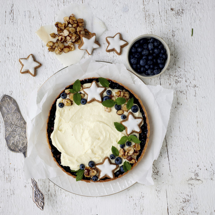 Das Frosting auf die abgekühlte Tarte verstreichen und einen Halbmond aus feinen Minzblättchen, Haselnusskrokant, Blaubeeren, Zimtsternen ... legen.