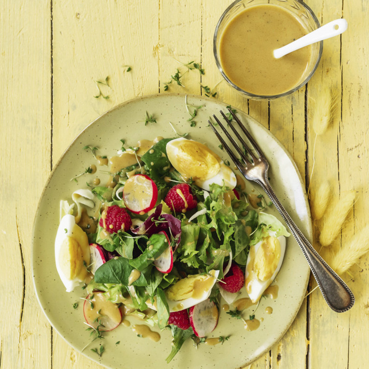 Den Salat anrichten, mit Himbeeren und Eiervierteln dekorieren, mit dem Dressing beträufeln und mit Kresse bestreuen.