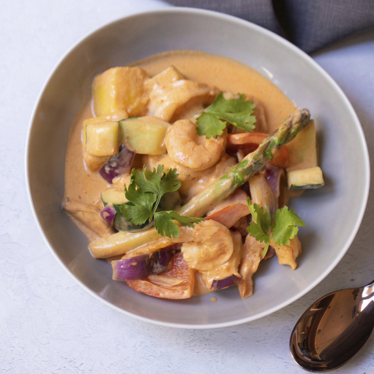 Currypaste in der gleichen Pfanne anrösten, mit Kokosmilch aufgießen und kurz kochen lassen. Mit einem Stabmixer aufmixen. Nun die geschälten Garnelen darin garen. Mit Salz würzen und über das Gemüse geben und mit Koriander dekorieren