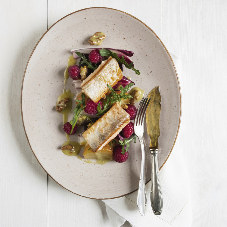 Gebackene Bete mit Himbeeren, Radicchio-Rucola-Salat und Walnuss-Vinaigrette mit Seesaibling (von Johann Lafer)
