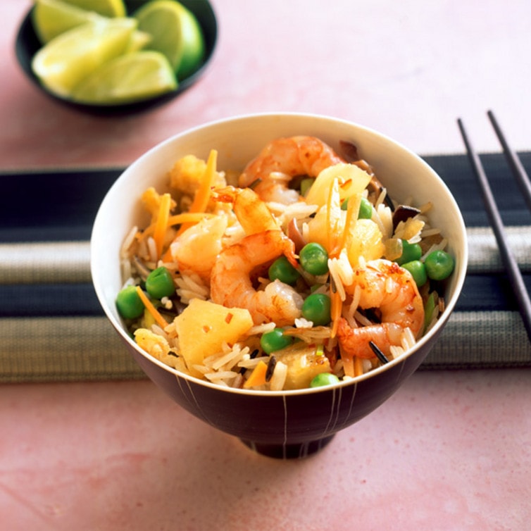 Chinese gebakken rijst smaakt heerlijk en is makkelijk te bereiden. U kunt de ingrediënten naar eigen smaak variëren. Voor nu vindt u een goed voorbeeld van een mogelijk combinatie. Wanneer u geen garnalen mag of niet lekker vindt kunt u het vervangen met kip. Wilt u het exotischer? Voeg dan blokjes mango toe!