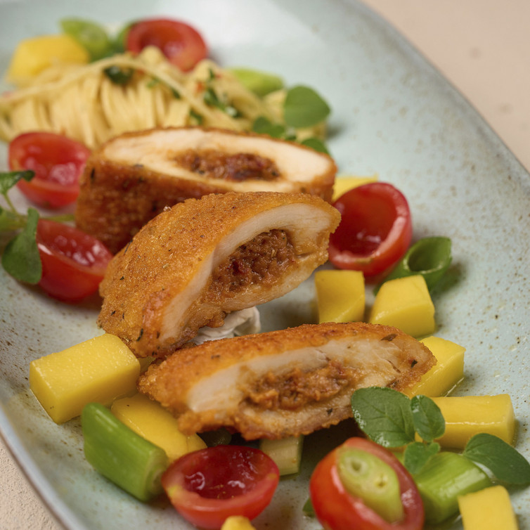 Gefülltes Hähnchenbrustfilet "Tomate-Mozzarella" mit Mango-Lauchsalat