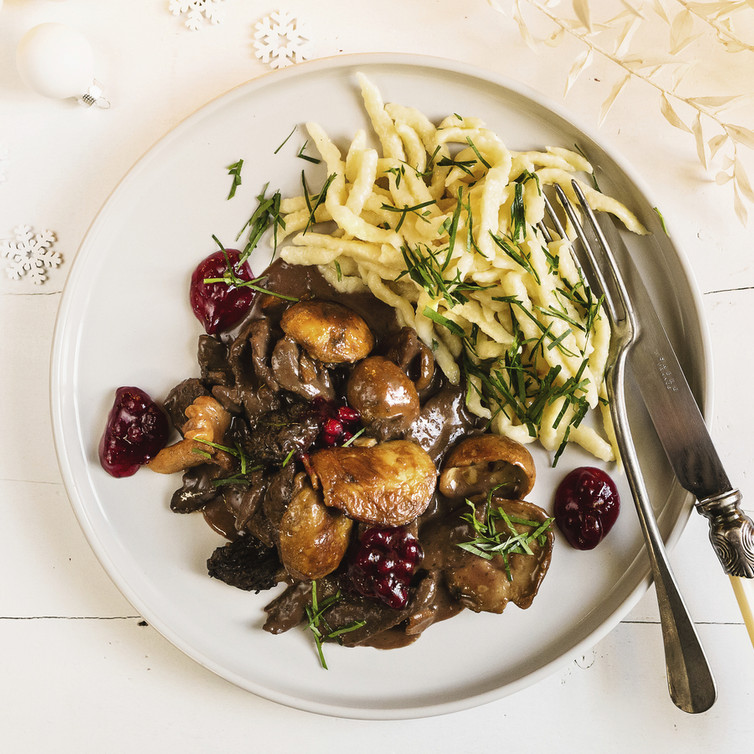 Das heiße Geschnetzelte vom Damhirsch aus dem Beutel in einen Topf geben, mit 2 EL Preiselbeeren und einem Schuss Gin abrunden und zum Schluss die gebratenen Pilze unterheben.