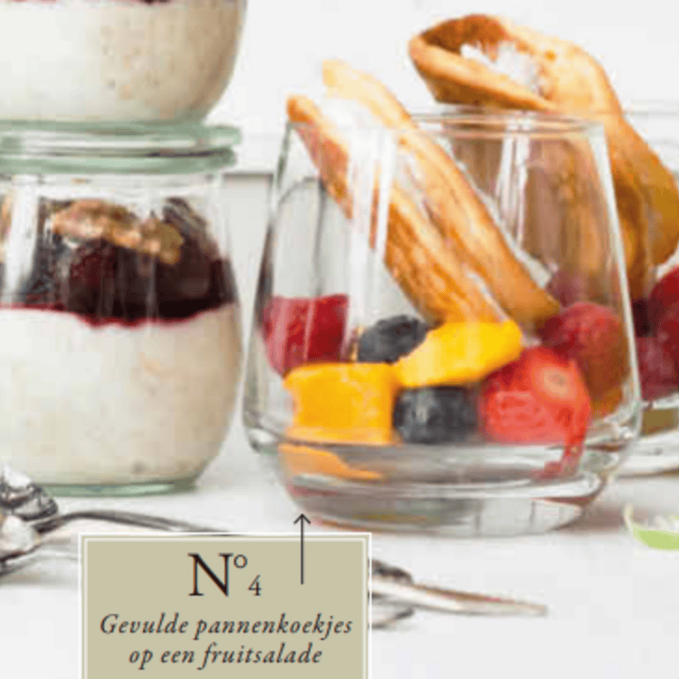 Leg de pannenkoeken op de fruitsalade.