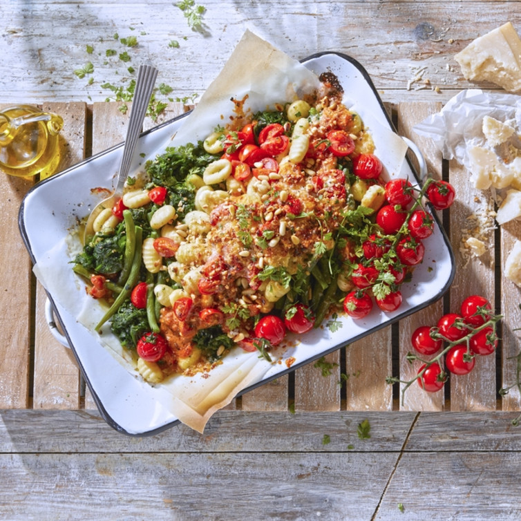 Gemüse mit Gnocchi vermengen und in eine Gratinform verteilen. Tomaten waschen, vierteln, mit der Tomatensauce vermischen und auf die Gnocchi-Mischung geben.