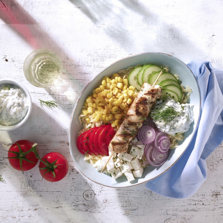 Die gekochten Orzo-Nudeln gleichmäßig auf 4 Schalen verteilen. Die marinierten Hähnchenspieße auf einem Grill oder in einer Grillpfanne bei mittlerer Hitze grillen, bis sie durchgegart und goldbraun sind. Anschließend die gegrillten Hähnchenspieße über die Orzo-Nudeln in den Schalen legen.